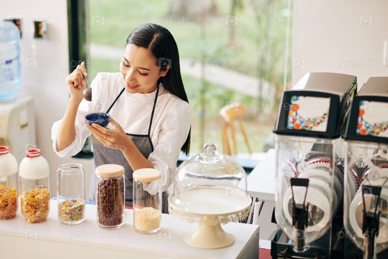 Официант добавляет порции мороженого