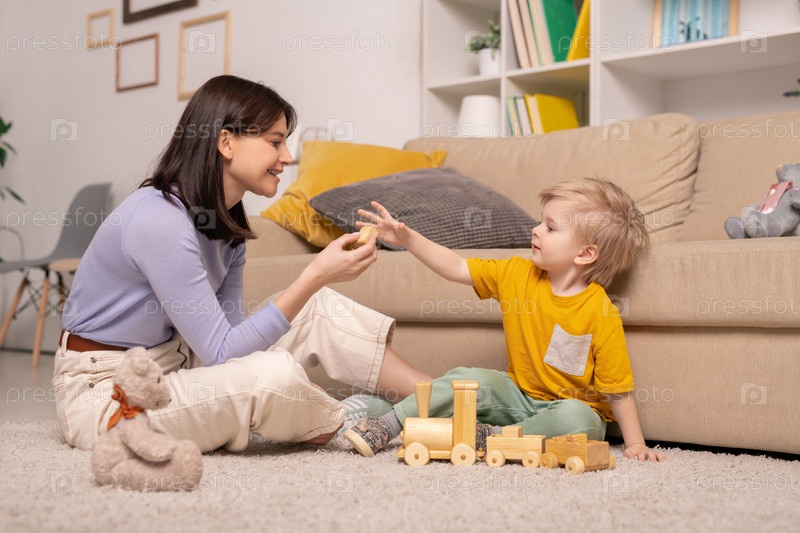 Милый мальчик сидит на полу и берет кубик игрушки из рук своей матери