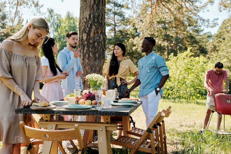 Группа молодых международных друзей в повседневной одежде, разговаривающих за приготовленным столом