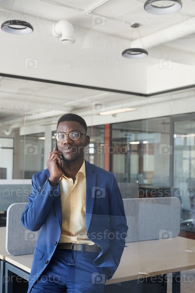 Молодой африканский бизнесмен разговаривает по телефону в офисе