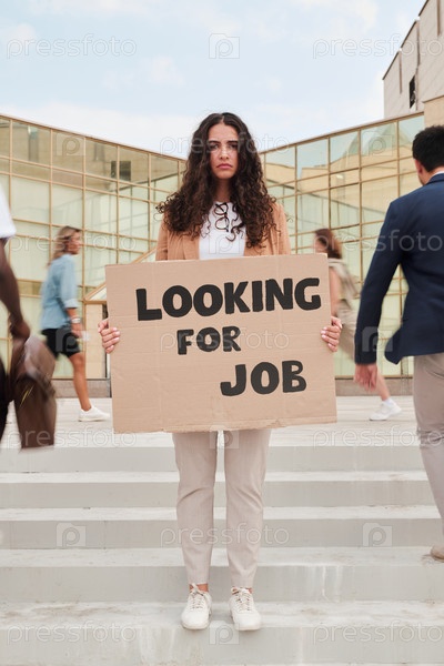 Молодая безработная женщина держит кусок картона с уведомлением о поиске работы