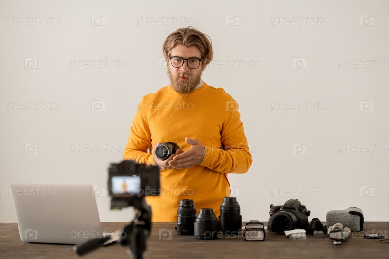 Бородатый фотограф показывает компонентные части новой модели фотоаппарата