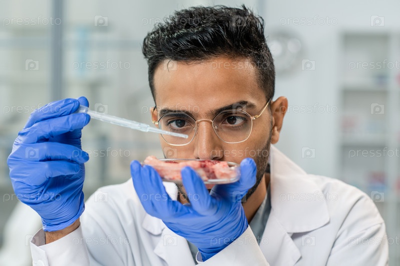 Молодой серьезный мужской научный исследователь внимательно смотрит на мясо