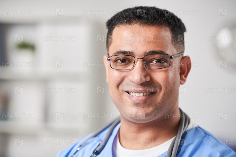 Горизонтальный крупный портрет радостного молодого взрослого врача общей практики Ближнего Востока, который носит очки и смотрит на камеру, улыбается, копирует пространство