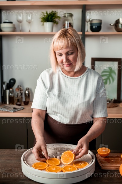 Домашняя хозяйка средних лет в футболке и фартуке кладет нарезы апельсина на фруктовый сушильник