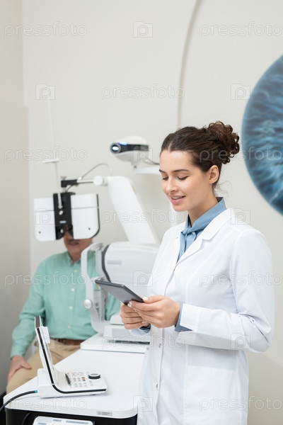 Счастливая молодая офтальмолог-женщина в белом халате смотрит на планшетный дисплей