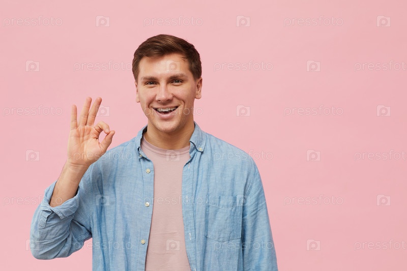 Мужчина показывает правильный жест, стоящий на розовом фоне