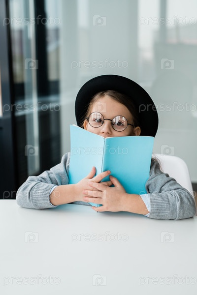 Милая маленькая школьница в очках смотрит на тебя, держа открытую книгу