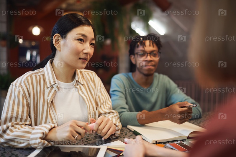 Бизнесвумен в кафе встречается с азиатами