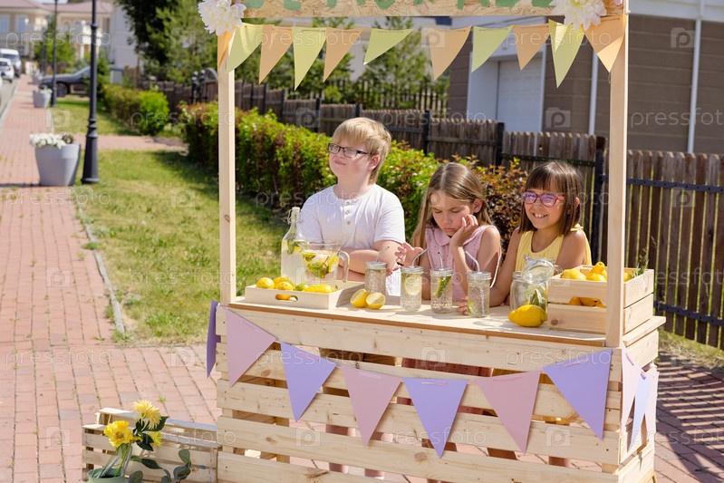 Группа очаровательных девочек и мальчика, стоящих у деревянного киоска и продающих лимонад