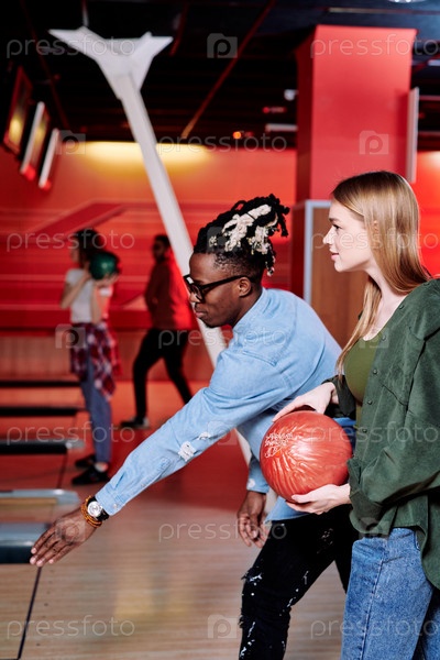 Африканский парень с растянутой рукой объясняет девушке, как бросать мяч для боулинга