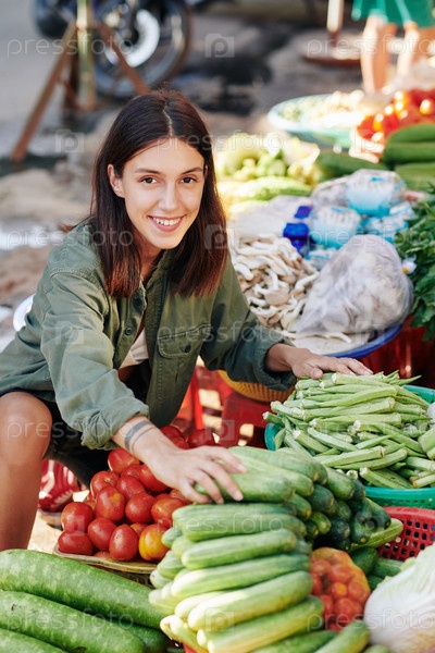 Веселая женщина, выбирающая овощи