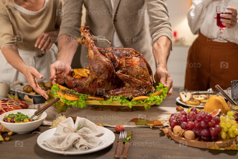 Руки зрелого мужчины ставят поднос с большой жареной домашней индейкой на стол