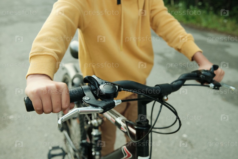 Рука современного мальчика-подростка, толкающего велосипед при движении по дороге