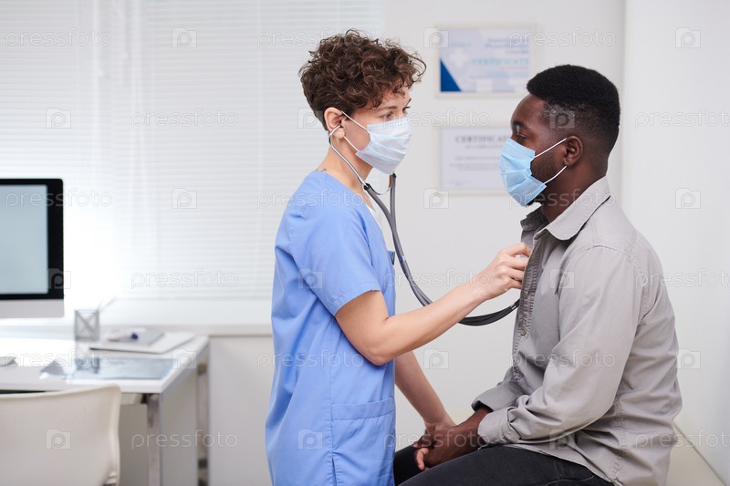 Средний боковой вид портретный снимок профессиональной медицинской работницы, осматривающей афроамериканского пациента с помощью стетоскопа