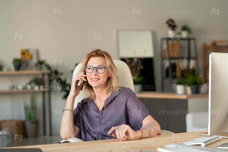 Веселая женщина средних лет со смартфоном в ухе, звонящая на рабочем месте
