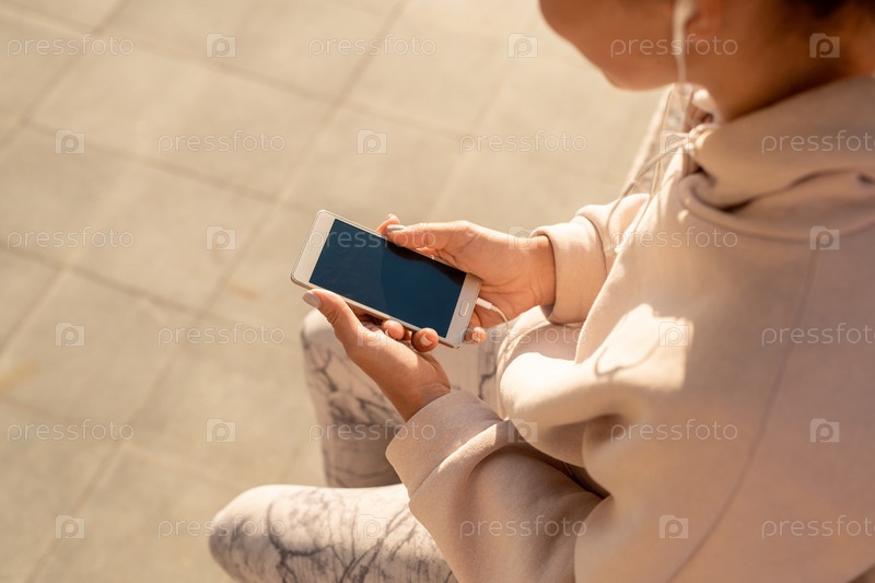 Руки молодой спортсменки, слушающей музыку или онлайн-курс спортивных тренировок