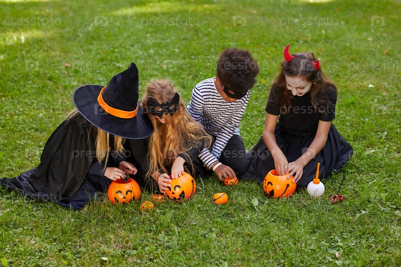 Группа детей, играющих на улице в Хэллоуин