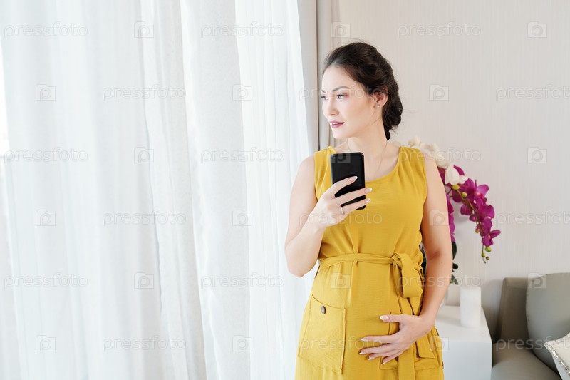 Беременная женщина смотрит в окно