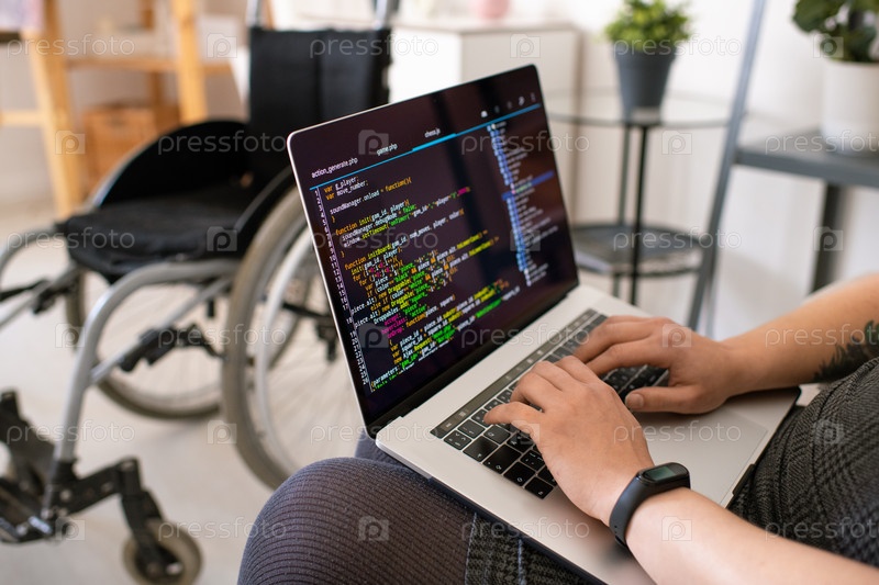 Руки молодой современной инвалидной женщины-программистки, прикасающейся к клавишам ноутбука
