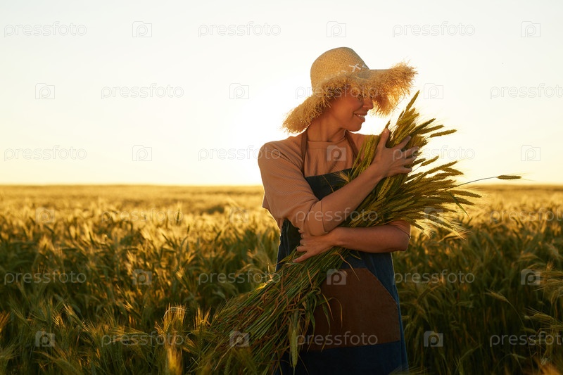 Девушка, которая держит ржавый рожь на поле Заката