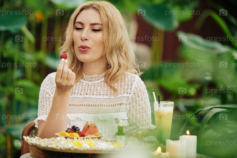 Женщина ест фрукты и ягоды