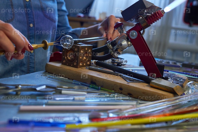Молодая креативная женщина, сидящая за столом в мастерской перед рабочим горелкой