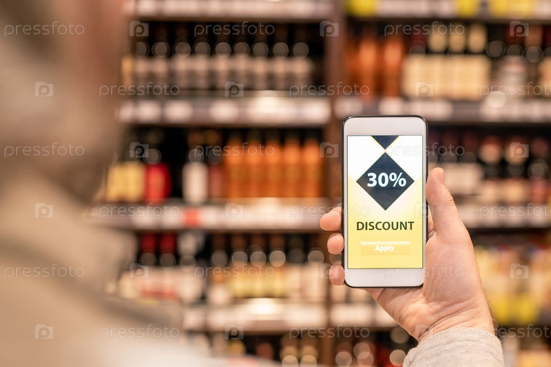 Рука современного зрелого мужчины со смартфоном, показывающий заявку на скидку