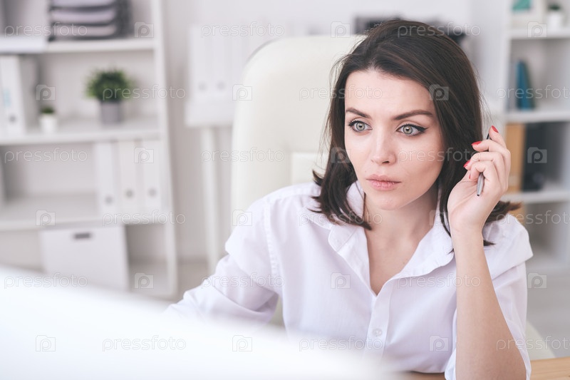 Молодая серьезная женщина в белой рубашке, держащая перо в руке