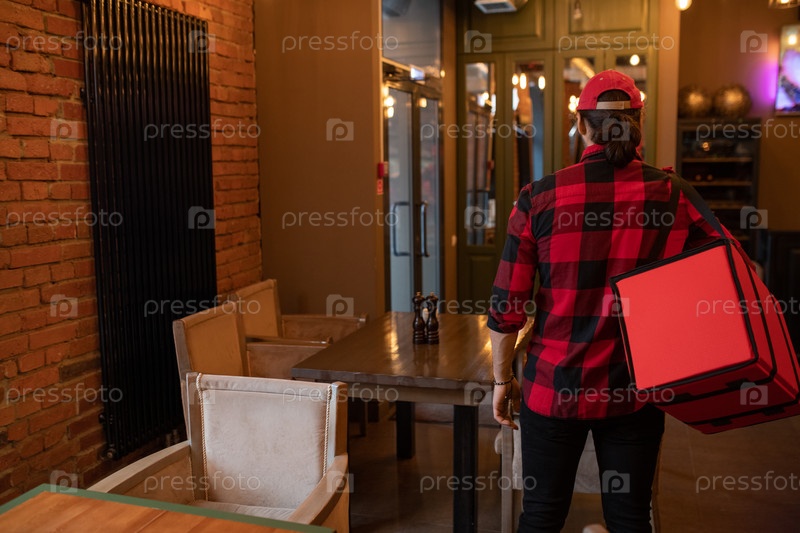 Задний вид молодого курьера службы доставки в фланеле, несущего большую красную сумку