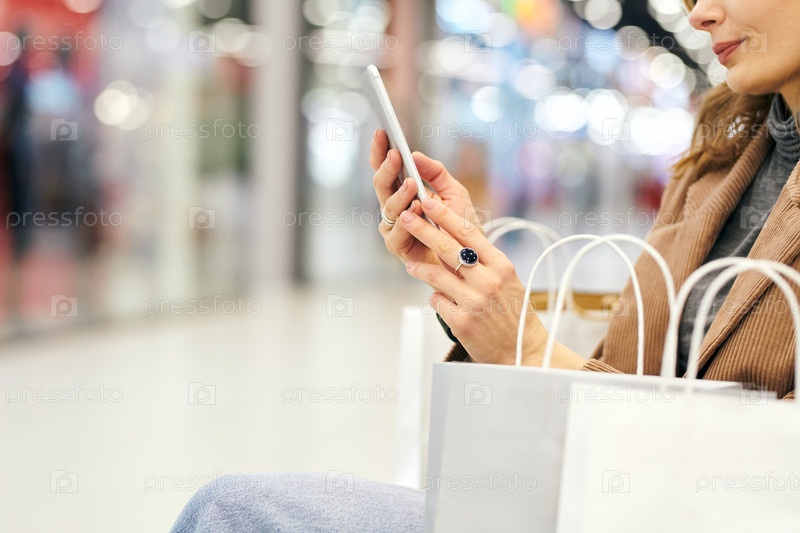 Руки молодой элегантной покупательницы, просматривающей рекламу в телефоне