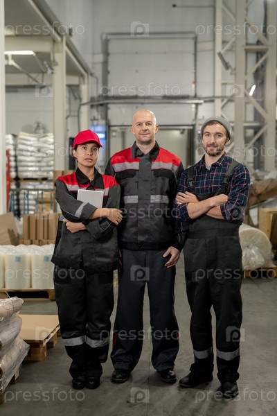 Группа успешных профессионалов-мужчин и женщин, стоящих в коридоре на складе