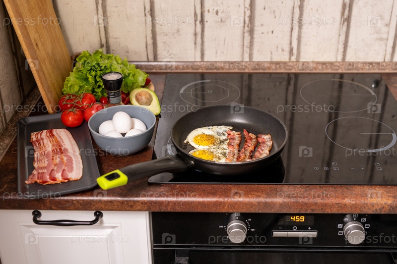 Кастрюля с жаренными яйцами и беконом на плите со свежими фруктами и овощами рядом