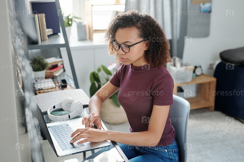 Современная молодая студентка в повседневной одежде, сидящая перед ноутбуком
