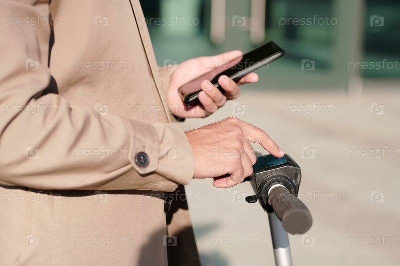Рука современного бизнесмена в бежевом плаще прокручивает смартфон