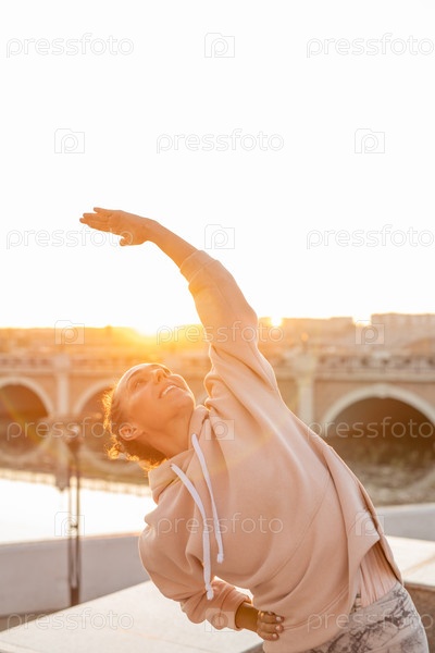 Счастливая молодая в форме женщина растягивает руку и смотрит на нее во время тренировки
