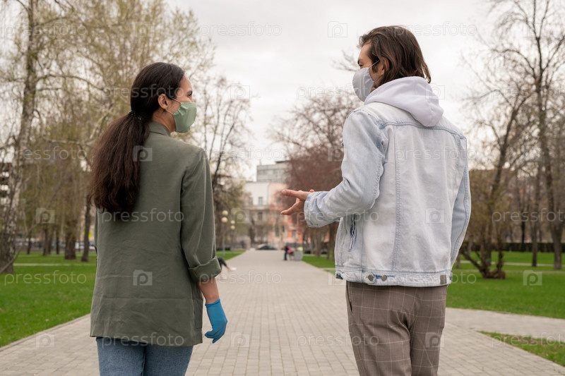 Задний вид молодой современной пары в масках и повседневной одежде, разговаривающей