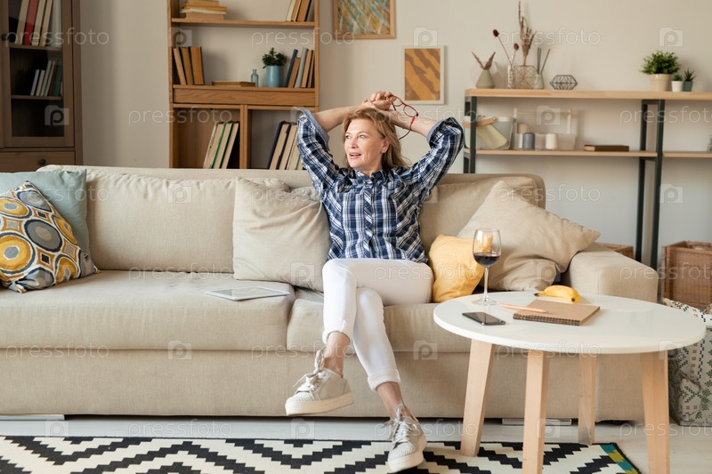 Расслабленная женщина средних лет в повседневной одежде, сидящая на диване в гостиной