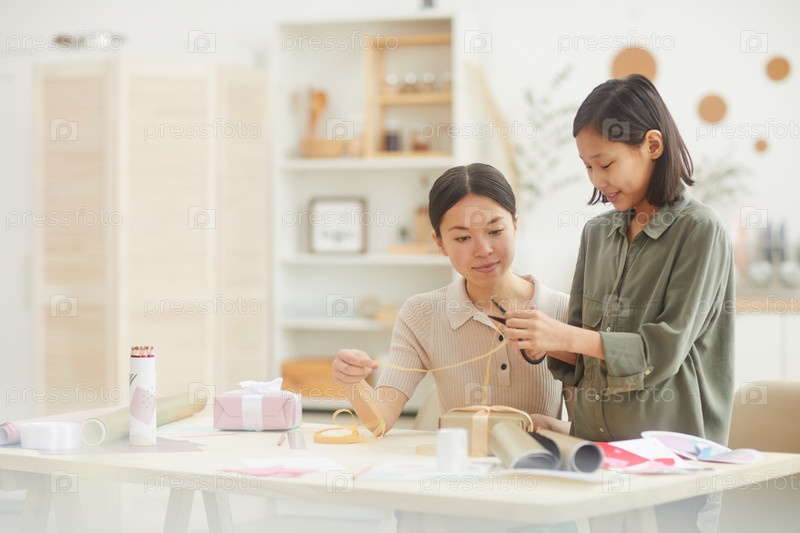 Девочка, режущая ленту для подарочной коробки