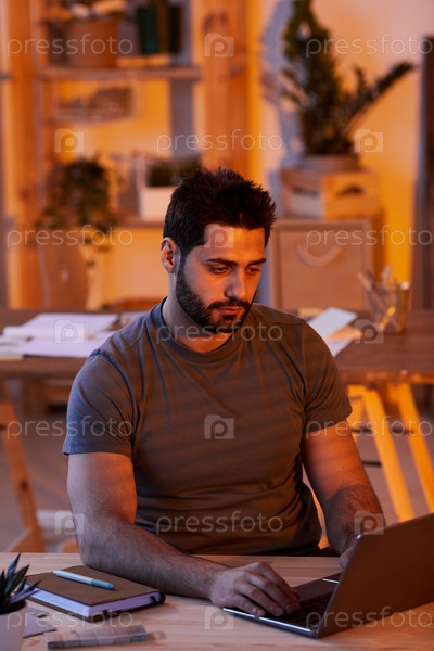 Беременный мужчина работает допоздна дома