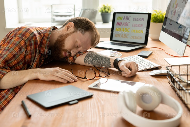 Усталый молодой креативный дизайнер с татуировкой на левой руке дремлет у рабочего места
