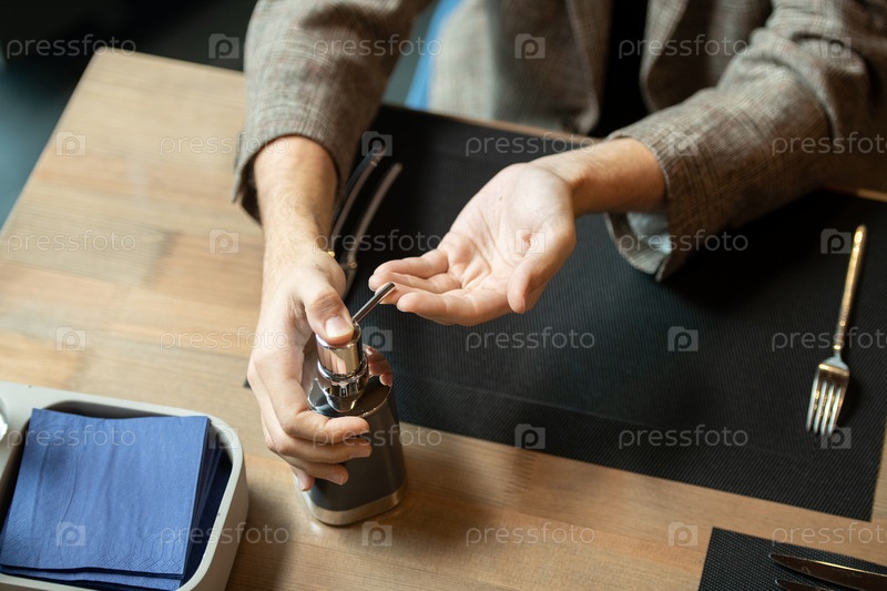 Руки мужчины, нажимающие диспенсер пластиковой банки с дезинфицирующим средством по обслуживаемому столу