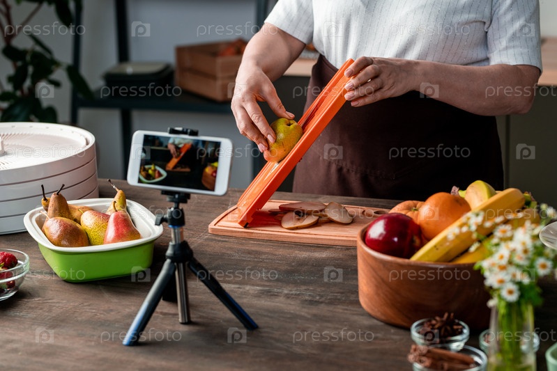 Домашняя хозяйка или блоггер стоит за кухонным столом перед камерой смартфона