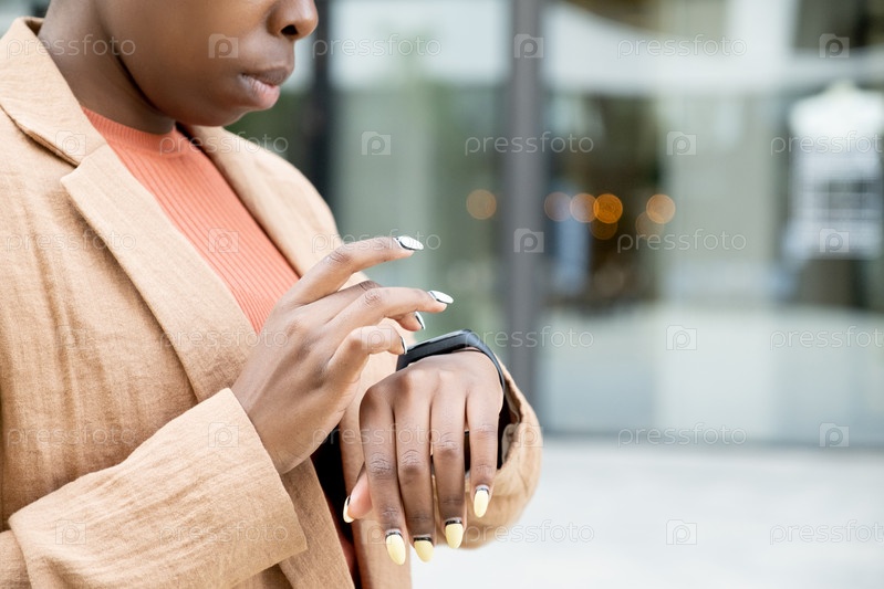 Руки молодой африканской женщины в повседневной одежде касаются дисплея умных часов