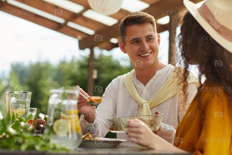 Молодая пара наслаждается ужином на улице на летней вечеринке