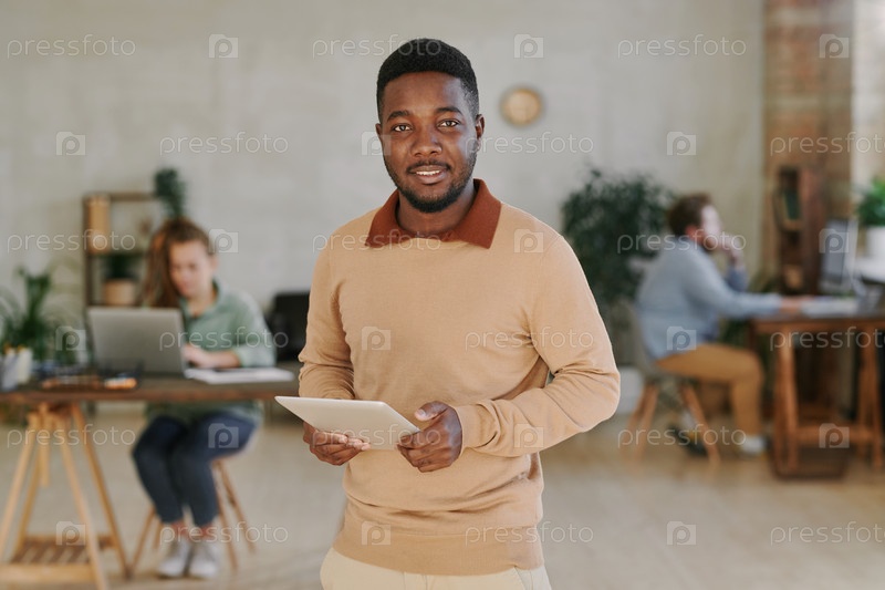 Портрет улыбающегося молодого чернокожего мужчины с бородой, стоящего с цифровым планшетом в современном офисе