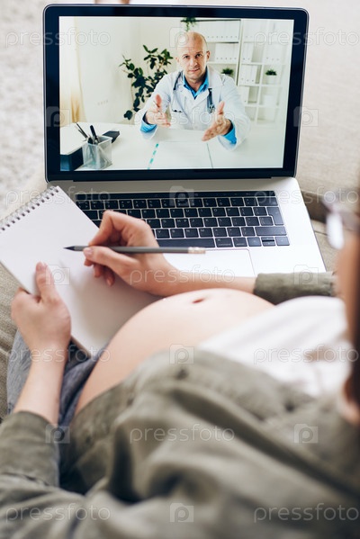 Современная беременная женщина консультируется со своим врачом через видеочат