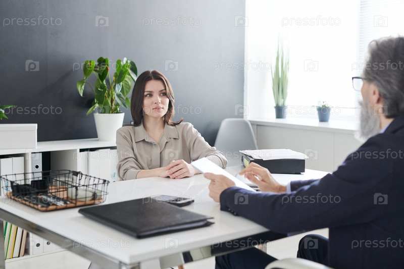 Серьезный брюнетка клиент психолога, смотрящий на него во время обсуждения