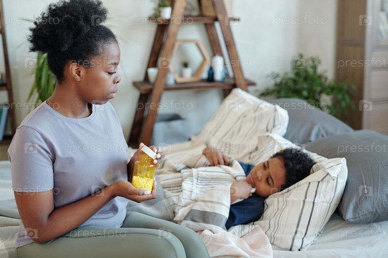 Молодая мать осторожно держит бутылку с таблетками, сидя рядом со своим больным сыном