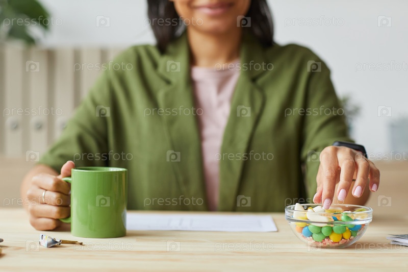 Улыбающаяся молодая женщина наслаждается закусками на работе
